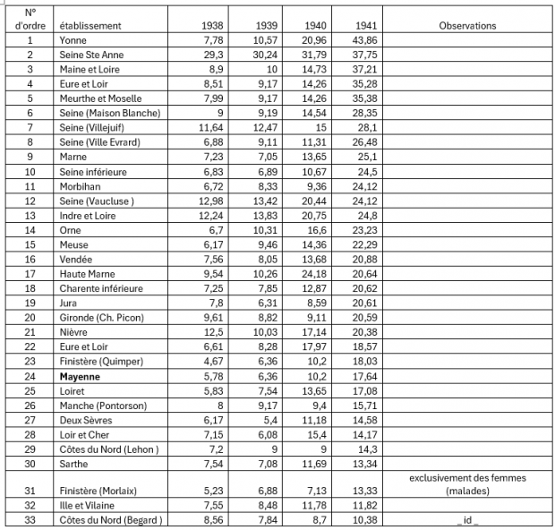 33 réponses nous sont parvenus Au moyen desquels le tableau ci-après été dressé, tableau qui fait ressortir que sur les 33 établissements ayant répondu, 23 ont un pourcentage plus élevé que le nôtre, 9 ayant enregistré un chiffre inférieur (2 de ces derniers établissements sont réservés aux femmes ; or il est a remarqué que jusqu’ici la mortalité chez les femmes pour l’ensemble des asiles beaucoup moins élevés que chez les hommes, bien que les effectifs de ces derniers soit partout moins important.